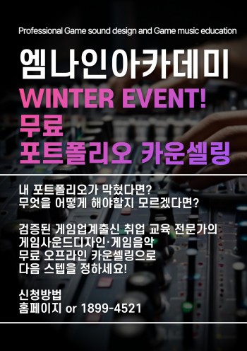 엠나인아카데미학원은 게임 사운드 디자인, 게임 음악 작곡, 영상 사운드 디자인/음악작곡, 비쥬얼아트 전문교육 학원으로서